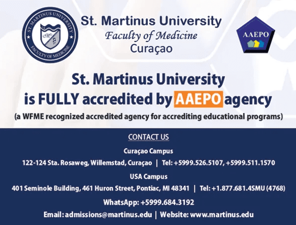 Willemstad,Curaçao November 20th – The St. Martinus University Faculty of Medicine is pleased to announce its successful attainment of full institutional accreditation from the Agency for Accreditation of Educational Programs and Organizations (AAEPO) in Kyrgyzstan, an agency accredited by WFME. This significant accreditation, valid until 2028, underscores the institution’s unwavering commitment to upholding elevated standards of education and academic excellence.